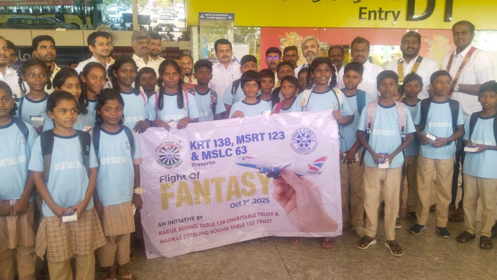 கரூர் ரவுண்ட் டேபிள் 138, மெட்ராஸ் ஸ்டெர்லிங் ரவுண்ட் டேபிள் 123 மற்றும் மெட்ராஸ் லேடீஸ் சர்கிள் 63 ஆகியவை இணைந்து “ஃப்ளைட் ஆஃப் ஃபான்டஸி” எனும் சிறப்பான முயற்சியின் கீழ், கரூர் சோமூர் அரசு மேல்நிலைப் பள்ளியின் 30 மாணவர்கள் மற்றும் 3 ஆசிரியர்களுக்கு, கோயம்புத்தூரிலிருந்து சென்னைக்கு அவர்களின் முதல் விமானப் பயண அனுபவத்தை வழங்கியதில் பெருமிதம் கொள்கின்றன. கல்விக்கூடங்களைத் தாண்டி, உலகை அறியும் ஆச்சரியத்தையும், வாழ்நாள் முழுதும் நினைவில் நிற்கும் அனுபவங்களையும் வழங்கும் இந்த ஊக்கமூட்டும் பயணம், மாணவர்களின் கனவுகளுக்கு புதிய சிறகுகளை சேர்த்துள்ளது. இந்த அரிய வாய்ப்பை உருவாக்கிய ரவுண்ட் டேபிள் இந்தியா, திரு. வெங்கட் ராகவன், திரு. அஜய் மோகன் மற்றும் திருமதி நந்திதா ஆகியோருக்கு இதயம் கனிந்த நன்றி.