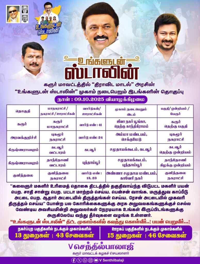 மாண்புமிகு தமிழ்நாடு முதலமைச்சர் தளபதி மு.க. ஸ்டாலின் அவர்களின் ஆணைக்கிணங்க #உங்களுடன்_ஸ்டாலின் திட்டத்தின் சிறப்பு முகாம்கள், 09/10/2025 அன்று கரூர் மாவட்டத்தில் நடைபெறும் இடங்கள்.. பொதுமக்கள் அனைவரும் பயன்படுத்தி பயன்பெற அன்புடன் வேண்டுகிறேன்.