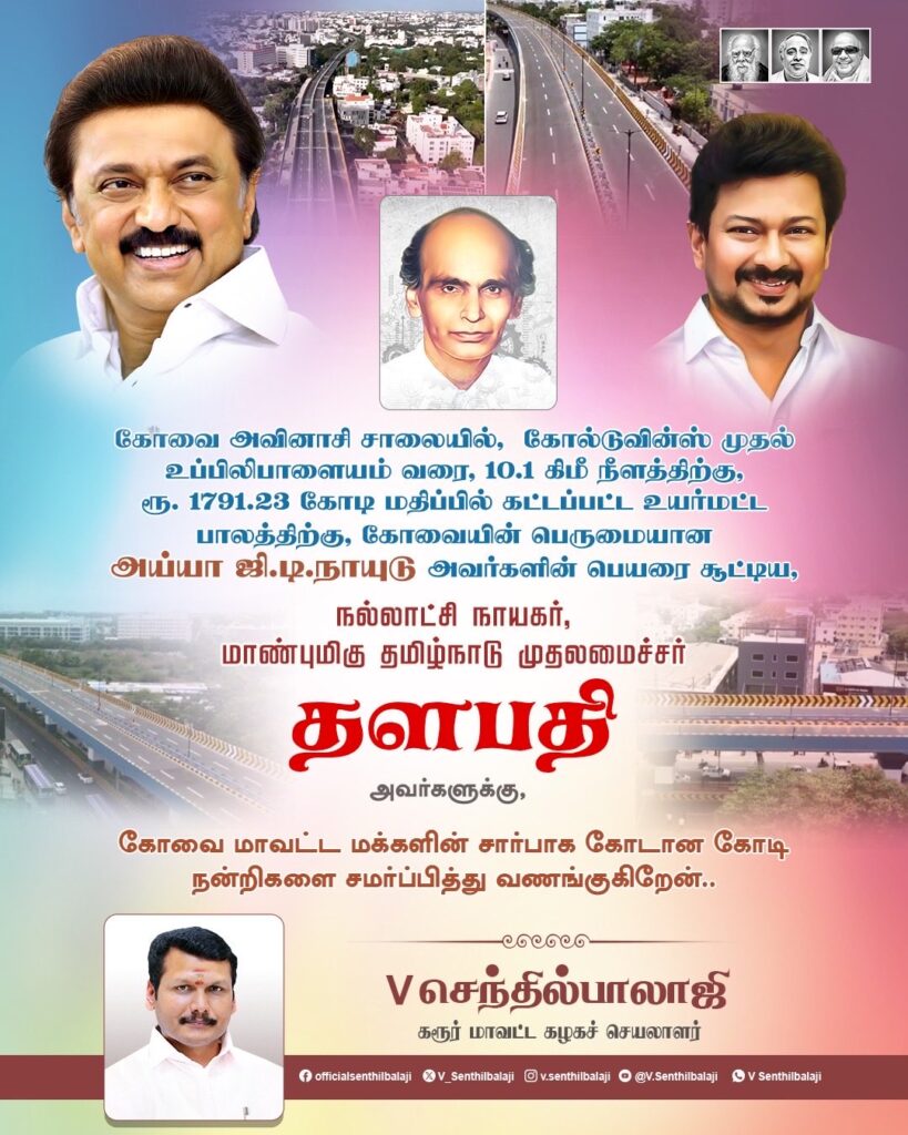கோவை அவினாசி சாலையில், கோல்டுவின்ஸ் முதல் உப்பிலிபாளையம் வரை, 10.1 கிமீ நீளத்திற்கு, ரூ. 1791.23 கோடி மதிப்பில் கட்டப்பட்ட உயர்மட்ட பாலத்திற்கு, கோவையின் பெருமையான அய்யா ஜி.டி.நாயுடு அவர்களின் பெயரை சூட்டிய, நல்லாட்சி நாயகர் மாண்புமிகு தமிழ்நாடு முதலமைச்சர் தளபதி மு.க. ஸ்டாலின் அவர்களுக்கு, கோவை மாவட்ட மக்களின் சார்பாக கோடான கோடி நன்றிகளை சமர்ப்பித்து வணங்குகிறேன்.