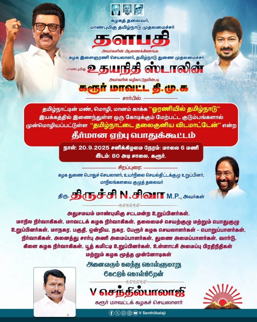 கழகத் தலைவர், மாண்புமிகு தமிழ்நாடு முதலமைச்சர் தளபதி மு.க. ஸ்டாலின் அவர்களின் ஆணைக்கிணங்க, மாண்புமிகு தமிழ்நாடு துணை முதலமைச்சர், இளம் தலைவர் உதயநிதி ஸ்டாலின் அவர்களின் வழிகாட்டுதலில், தமிழ்நாட்டின் மண், மொழி, மானம் காக்க ‘ஓரணியில் தமிழ்நாடு’ இயக்கத்தில் இணைந்துள்ள, ஒரு கோடிக்கும் மேற்பட்ட குடும்பங்களால் முன்மொழியப்பட்டுள்ள ‘தமிழ்நாட்டை தலைகுனிய விட மாட்டேன்’ என்ற தீர்மான ஏற்ப பொதுக்கூட்டம், நாளை மாலை 6:00 மணி அளவில், கரூர் 80 அடி சாலையில், கழகத் துணைப் பொதுச் செயலாளர், மாநிலங்களவை குழு தலைவர், அண்ணன் திருச்சி. N. சிவா அவர்கள் சிறப்புரையாற்ற நடைபெற இருக்கிறது.. கரூர் மாவட்ட சொந்தங்கள் அனைவரும் கலந்து கொள்ள அன்புடன் அழைக்கிறேன்..