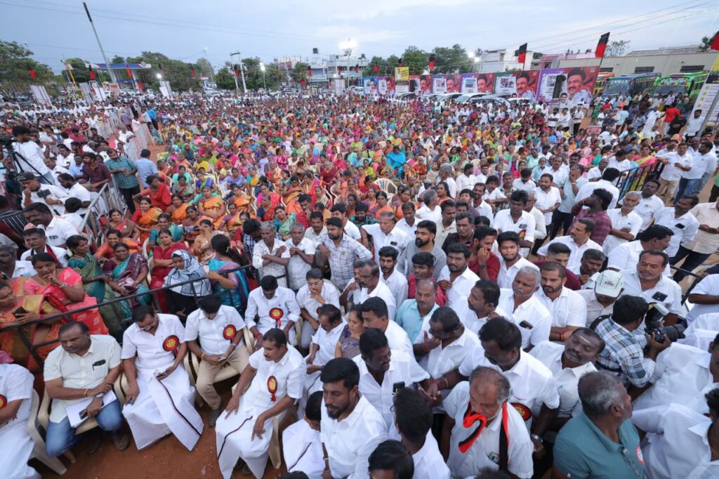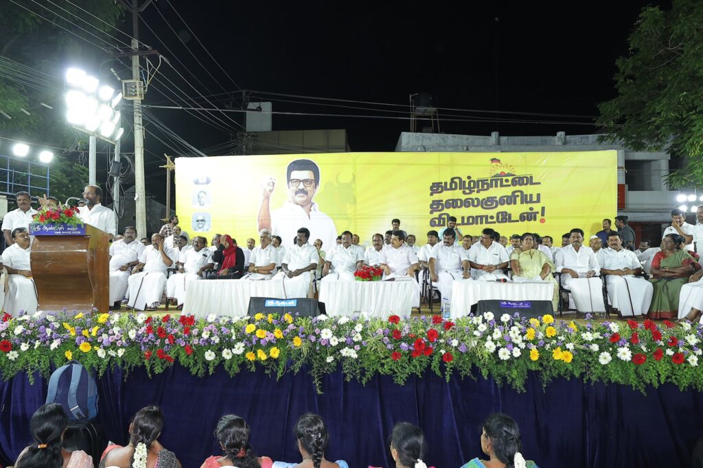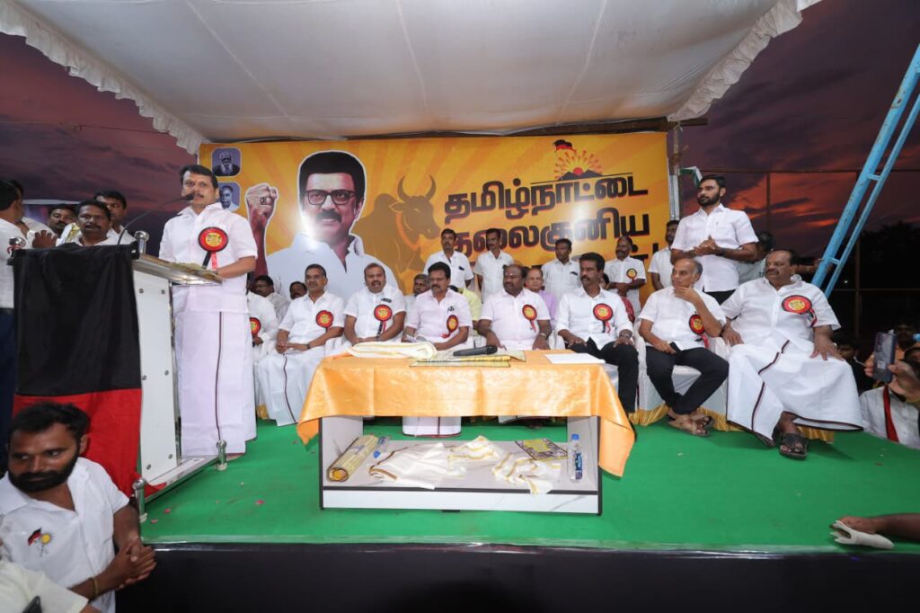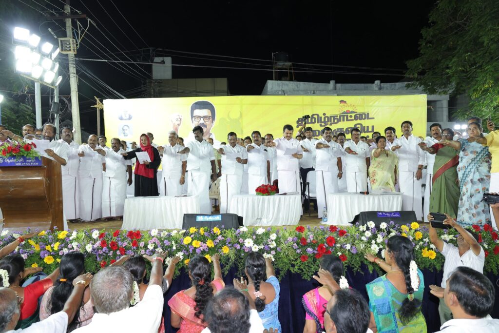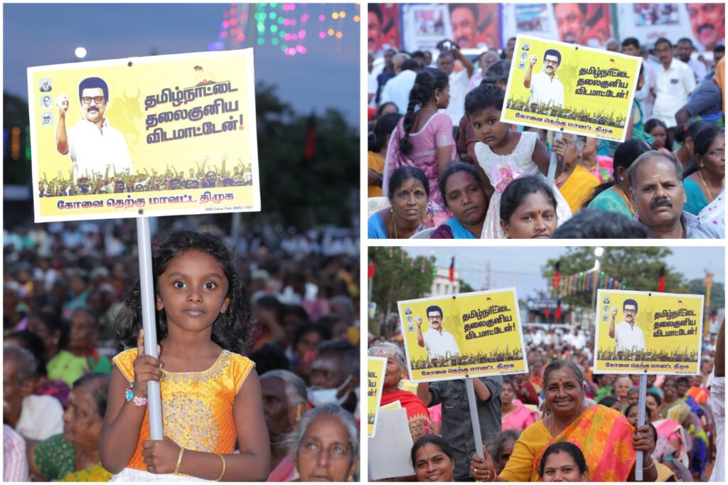 எளிய மக்களுக்கு என்றும் உரியவர், மாண்புமிகு தமிழ்நாடு முதலமைச்சர் தளபதி மு.க. ஸ்டாலின் அவர்களின் ஆணைக்கிணங்க, மாண்புமிகு தமிழ்நாடு துணை முதலமைச்சர், நமது நம்பிக்கை நாயகர் உதயநிதி ஸ்டாலின் அவர்களின் வழிகாட்டுதலில், கோவை தெற்கு மாவட்ட கழகத்தின் சார்பில், கோவை கருமத்தம்பட்டி கலைஞர் திடலில், தமிழ்நாட்டின் மண், மொழி, மானம் காக்க ‘ஓரணியில் தமிழ்நாடு’ இயக்கத்தில் இணைந்துள்ள, ஒரு கோடிக்கும் மேற்பட்ட குடும்பங்களால் முன்மொழியப்பட்டுள்ள ‘தமிழ்நாட்டை தலைகுனிய விட மாட்டேன்’ தீர்மான ஏற்ப பொதுக்கூட்டம், அனைவரும் உறுதிமொழியேற்க மிகச் சிறப்பாக நடைபெற்றது.. கோவை தெற்கு மாவட்ட செயலாளர் திரு. தளபதி முருகேசன் தலைமையில் நடைபெற்ற இக்கூட்டத்தில், கருமத்தம்பட்டி நகரச் செயலாளர் திரு. நித்யா மனோகரன் வரவேற்புரை வழங்க, மாண்புமிகு ஈரோடு கிழக்கு சட்டமன்ற உறுப்பினர் திரு. வி.சி. சந்திரகுமார் மற்றும் தலைமை கழக பேச்சாளர் திரு. சரவணன் மணிவேல் சிறப்புரையாற்ற, மாண்புமிகு மக்களவை உறுப்பினர்கள், கழக நிர்வாகிகள், உள்ளாட்சி அமைப்பு பிரதிநிதிகள், கழக தொண்டர்கள் மற்றும் பொதுமக்கள் கலந்துக் கொண்டனர்..