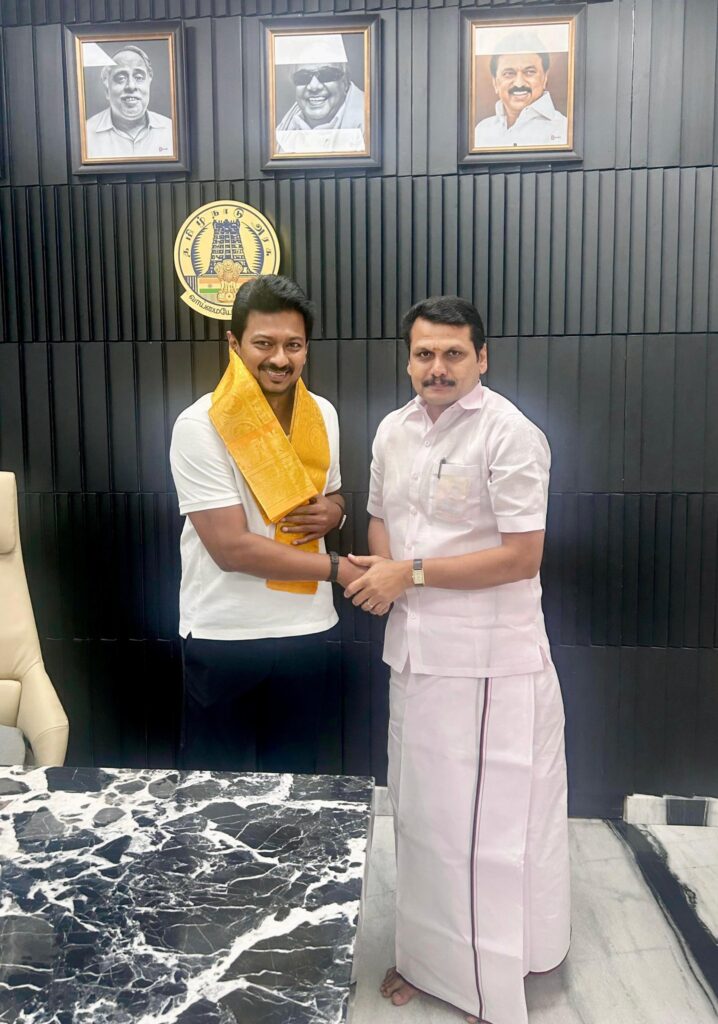 கழக இளைஞர் அணிச் செயலாளர், மாண்புமிகு தமிழ்நாடு துணை முதலமைச்சர், இளம் தலைவர் உதயநிதி ஸ்டாலின் அவர்களை, இன்று சந்தித்து, கரூரில் நடைபெற்ற கழக முப்பெரும் விழாவில் கலந்து சிறப்பித்தமைக்கு , கரூர் மாவட்ட மக்களின் சார்பாகவும், கரூர் மாவட்ட கழகத்தின் சார்பாகவும் கோடான கோடி நன்றிகளை சமர்ப்பித்த போது..