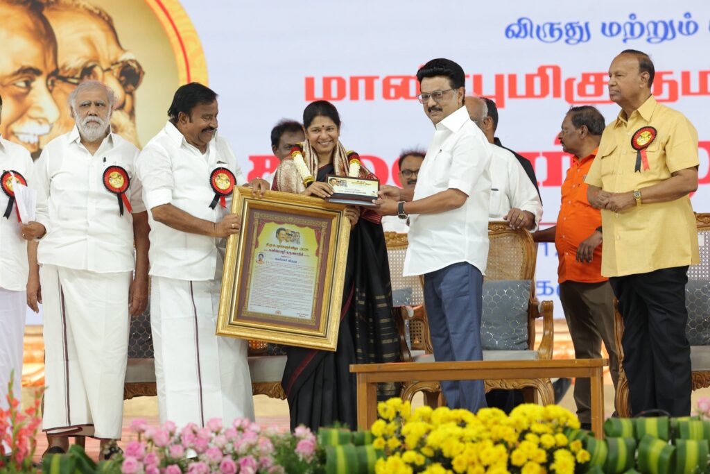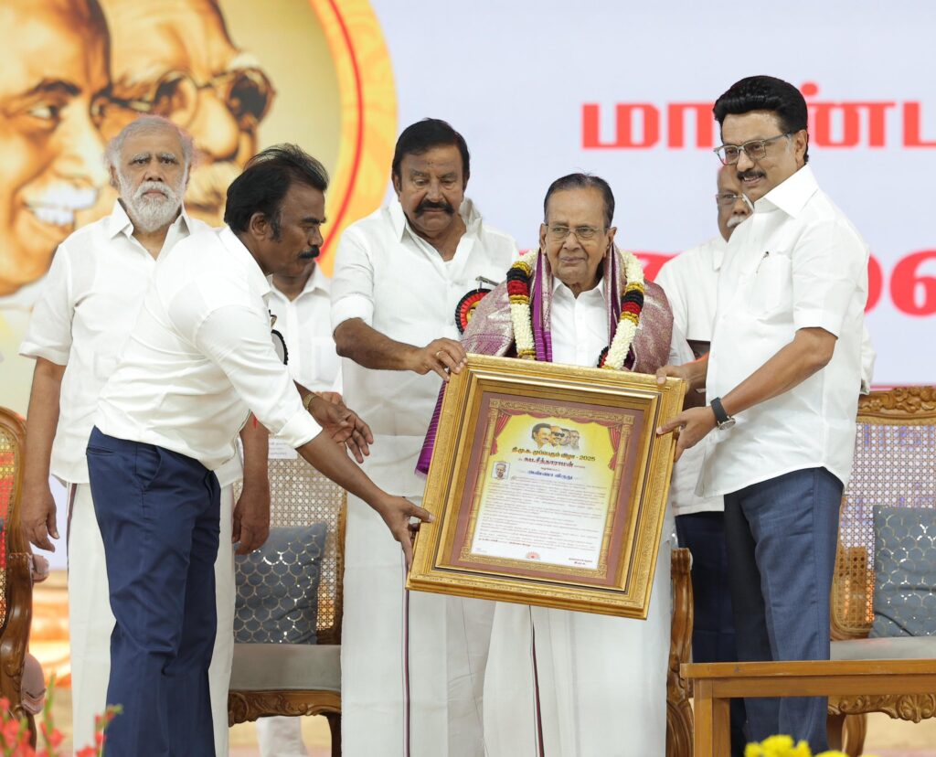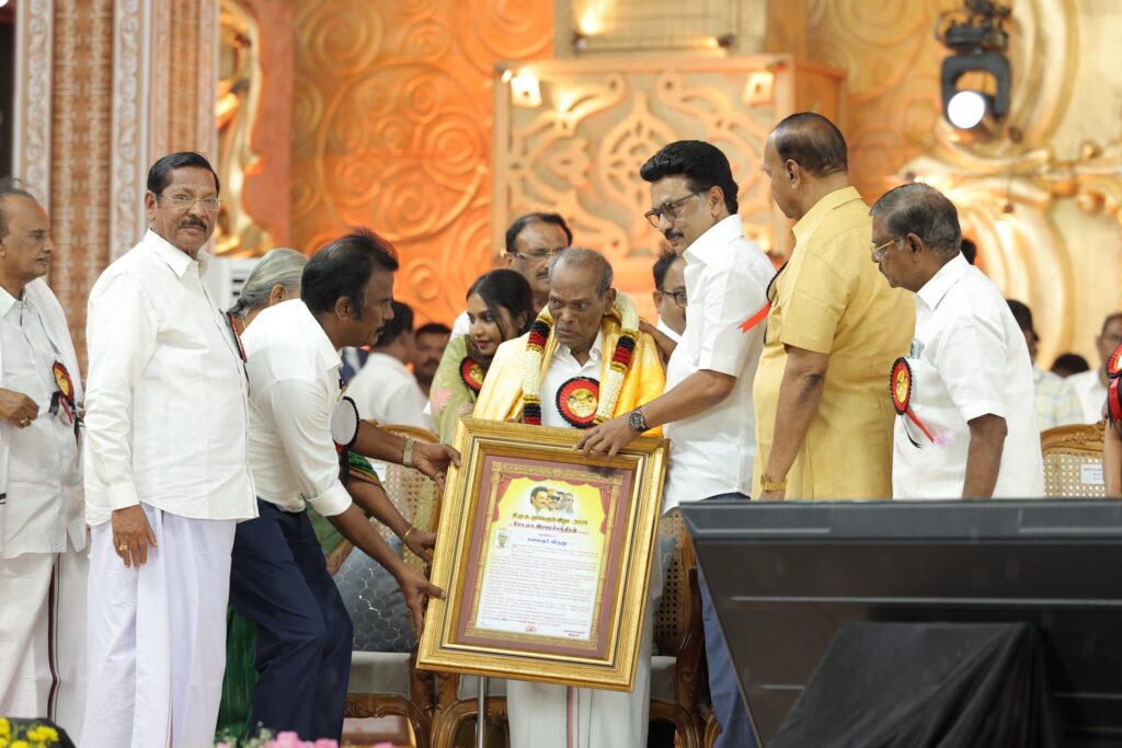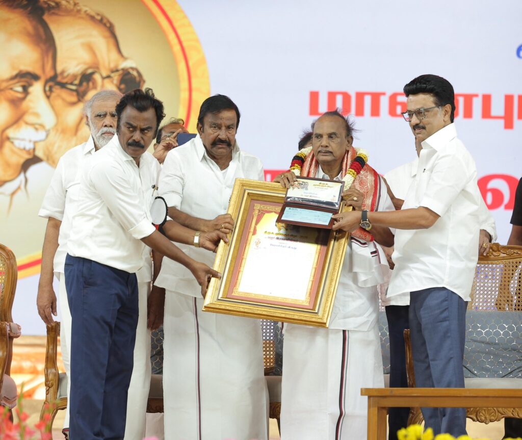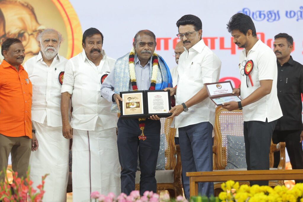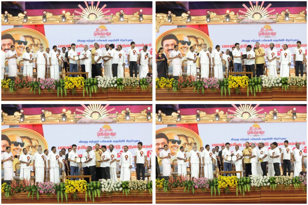 கழகத்தின் இரும்பு கோட்டையாம் கரூரில் இன்று நடைபெற்ற கழக முப்பெரும் விழாவில் கழகத் தலைவர், மாண்புமிகு தமிழ்நாடு முதலமைச்சர் தளபதி மு.க. ஸ்டாலின் அவர்களின் பொற்கரங்களால், பெரியார் விருது, அண்ணா விருது, கலைஞர் விருது, பாவேந்தர் விருது, பேராசிரியர் விருது, மு.க.ஸ்டாலின் விருது மற்றும் முரசொலி அறக்கட்டளை சார்பாக, முரசொலி செல்வம் விருது பெற்ற கழக முன்னத்தி ஏர்களுக்கும் பெருமக்களுக்கும் எனது மனமார்ந்த வாழ்த்துகளையும் நன்றிகளையும் பணிவன்புடன் தெரிவித்துக் கொள்கிறேன்.