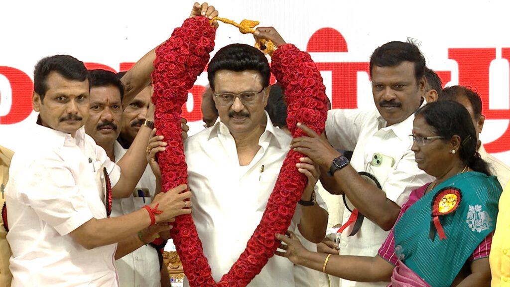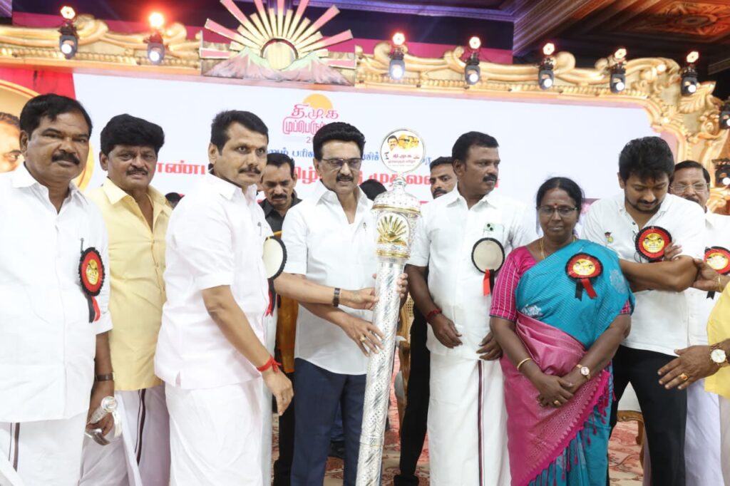 கழகத்தின் கோட்டையாம் கரூரில் நடைபெற்ற, தந்தை பெரியார் மற்றும் பேரறிஞர் அண்ணா பிறந்தநாள், தமிழ்நாட்டை காத்து நிற்கும் கோட்டையான திமுக தொடங்கப்பட்ட நாளை கொண்டாடும் கழக முப்பெரும் விழாவில், கழக முன்னோடிகளுக்கும் முன்னத்தி ஏர்களுக்கும் விருதுகள் மற்றும் பரிசுகள் வழங்கி சிறப்புரையாற்றிய, கழகத் தலைவர் மாண்புமிகு தமிழ்நாடு முதலமைச்சர் தளபதி மு.க. ஸ்டாலின் அவர்களுக்கு கரூர் மாவட்ட கழகத்தின் சார்பிலும், கரூர் மாவட்ட மக்களின் சார்பாகவும் எனது கோடான கோடி நன்றிகளை சமர்ப்பித்து வணங்குகிறேன்.