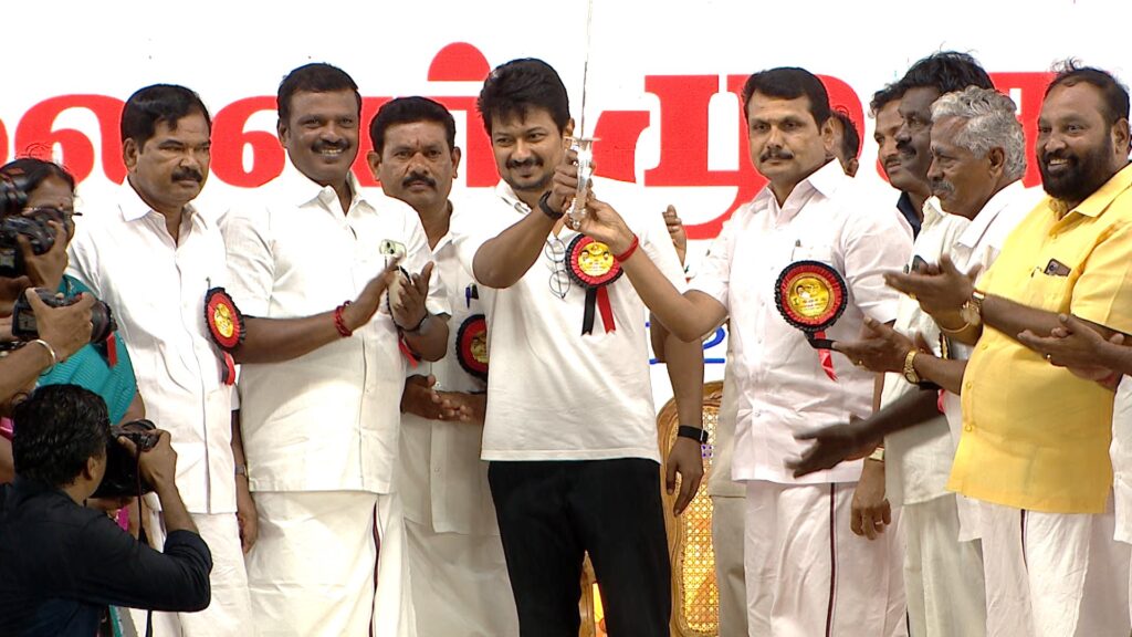 கரூரில் இன்று நடைபெற்ற கழக முப்பெரும் விழாவில், கழக இளைஞர் அணிச் செயலாளர், மாண்புமிகு தமிழ்நாடு துணை முதலமைச்சர், நமது நம்பிக்கை நாயகர் உதயநிதி ஸ்டாலின் அவர்களுக்கு, கரூர் மாவட்ட கழகத்தின் சார்பாக, வீர வாளும் நினைவுப் பரிசும் வழங்கிய பொன்னான தருணத்தில்.
