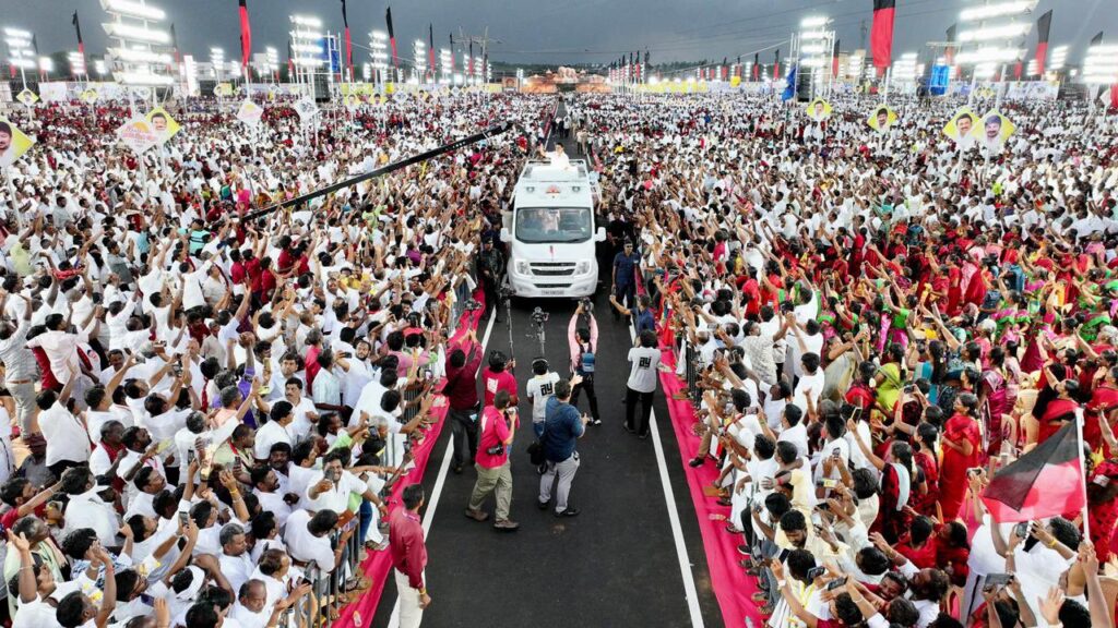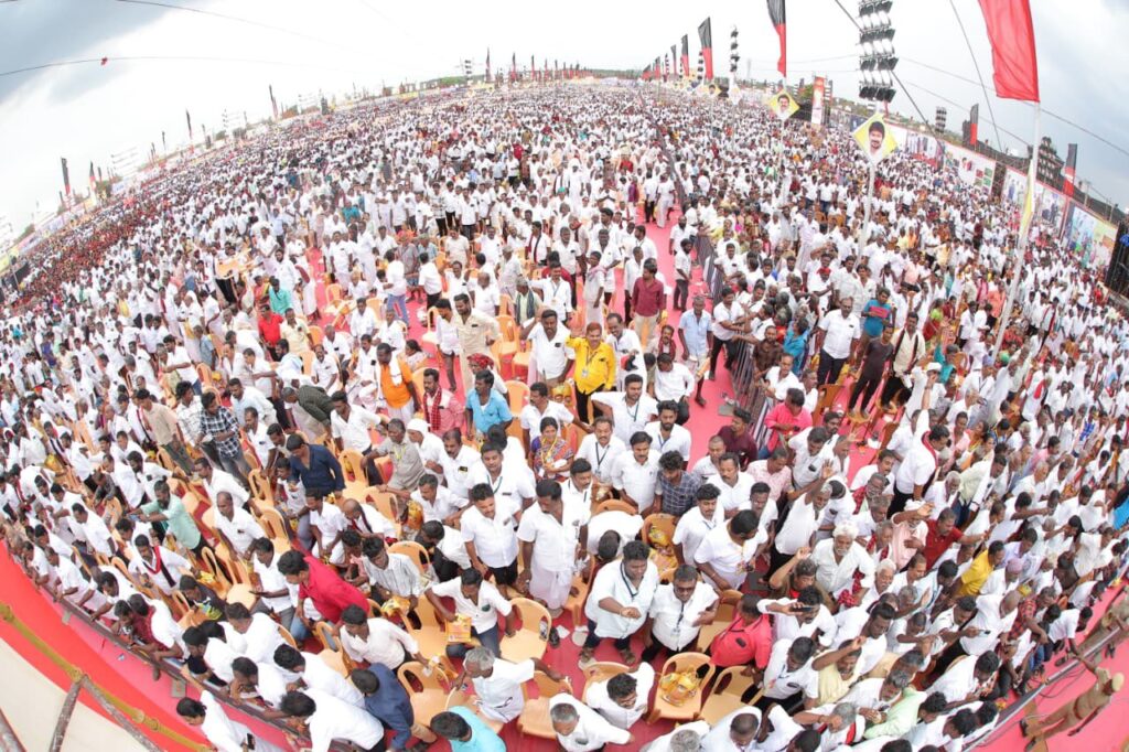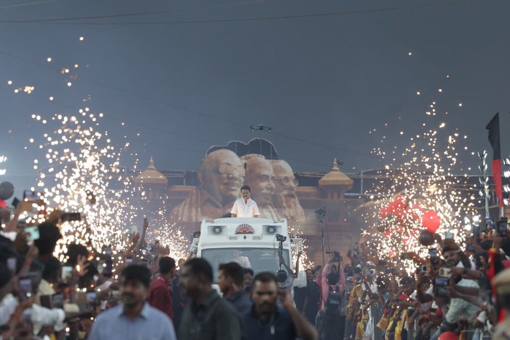 கழகத்தின் கொள்கை திருவிழாவாம், கழக முப்பெரும் விழாவிற்கு வருகை புரிந்த கழகத் தலைவர் மாண்புமிகு தமிழ்நாடு முதலமைச்சர் தளபதி மு.க. ஸ்டாலின் அவர்களுக்கு கழகத் தொண்டர்கள் உற்சாக வரவேற்பு அளித்த போது.