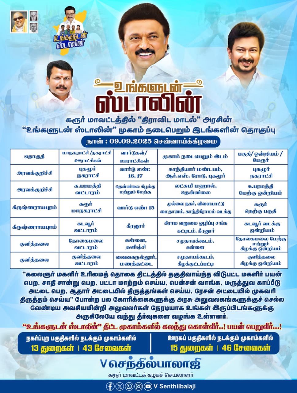 மாண்புமிகு தமிழ்நாடு முதலமைச்சர் தளபதி மு.க. ஸ்டாலின் அவர்களின் ஆணைக்கிணங்க #உங்களுடன்_ஸ்டாலின் திட்டத்தின் சிறப்பு முகாம்கள், வருகின்ற 10/09/2025 அன்று, கரூர் மாவட்டத்தில் நடைபெறும் இடங்கள்.. பொதுமக்கள் அனைவரும் பயன்படுத்தி பயன்பெற அன்புடன் வேண்டுகிறேன்.