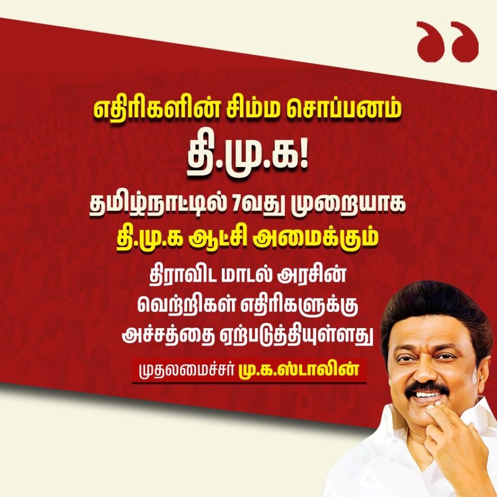 கழகத் தலைவர், மாண்புமிகு தமிழ்நாடு முதலமைச்சர் தளபதி மு.க. ஸ்டாலின் அவர்கள் கூறிய படி, களப்பணியில் கலைஞரின் உடன்பிறப்புகளான நம்மை வெல்ல, இங்கு எவரும் இல்லை எனக் காட்ட வேண்டிய நேரம். ‘என் வாக்குச்சாவடி வெற்றி வாக்குச்சாவடி’ என கழகத்தினர் அனைவரும், கருப்பு சிவப்பு கரை கொண்ட வேட்டி கட்டிய ஈட்டியென புயலாய் செயலாற்ற வேண்டிய தருணம். நலத்திட்ட நாயகரின் நல்லாட்சியின் மகத்துவத்தை சொல்வோம்.. நமது ஒவ்வொருவர் வாக்குச்சாவடியிலும் வெல்வோம். ஏழாவது முறையாக வெற்றி வாகை சூடி, மாண்புமிகு தமிழ்நாடு முதலமைச்சர் தளபதி அவர்களின் தலைமையிலான நல்லாட்சி தொடரச் செய்து வரலாறு படைப்போம்.