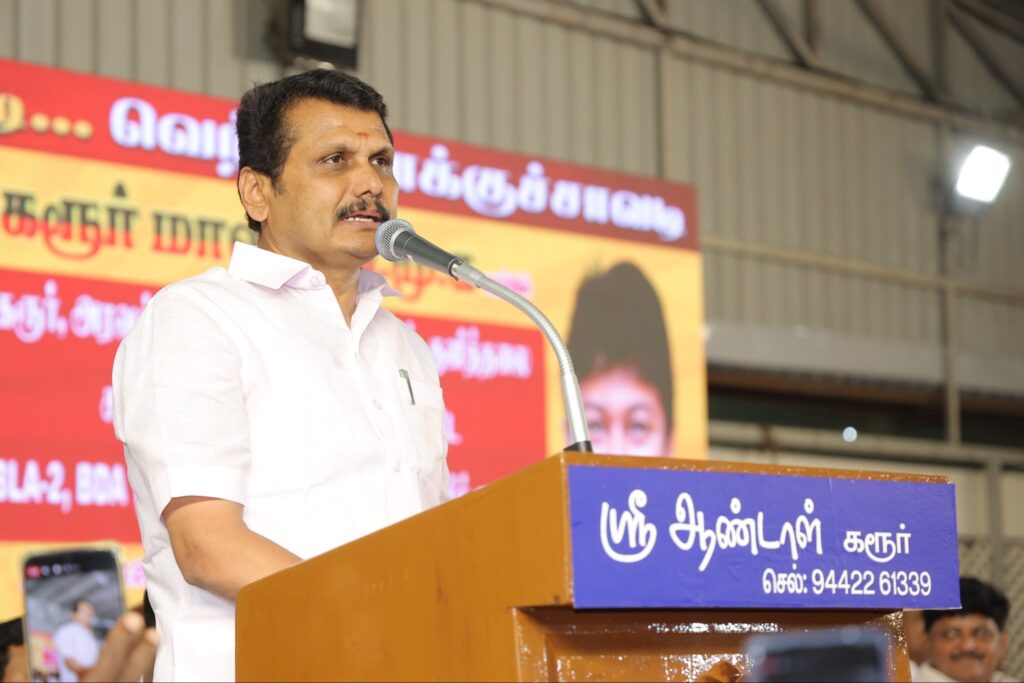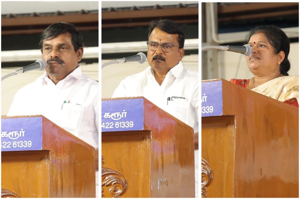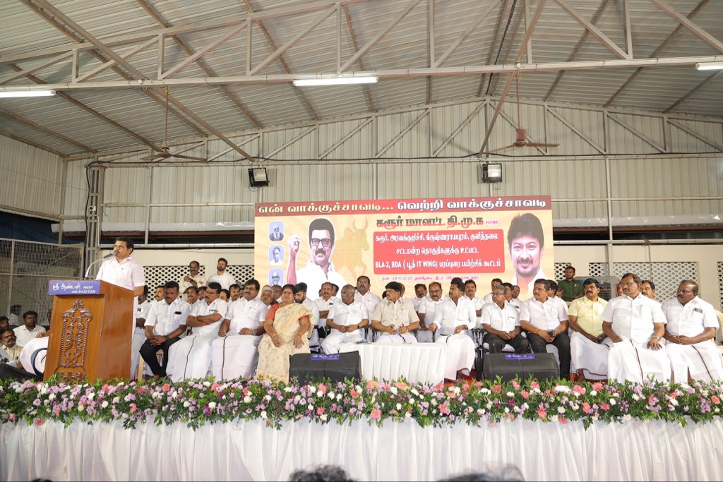 நல்லாட்சி நாயகர், மாண்புமிகு தமிழ்நாடு முதலமைச்சர் தளபதி மு.க. ஸ்டாலின் அவர்களின் ஆணைக்கிணங்க, மாண்புமிகு தமிழ்நாடு துணை முதலமைச்சர், நமது இளம் தலைவர் உதயநிதி ஸ்டாலின் அவர்களின் வழிகாட்டுதலின்படி, கரூர், அரவக்குறிச்சி, கிருஷ்ணராயபுரம் மற்றும் குளித்தலை சட்டமன்ற தொகுதிக்குட்பட்ட BLA-2 & BDA நிர்வாகிகள் கலந்து கொள்ள, ‘என் வாக்குச்சாவடி – வெற்றி வாக்குச்சாவடி’ ஆலோசனைக் கூட்டம் இன்று கரூர் பிரேம் மஹாலில் மிகச் சிறப்பாக நடைபெற்றது. இந்நிகழ்வில், மாண்புமிகு சட்டமன்ற உறுப்பினர்கள், மாநில நிர்வாகிகள், சட்டமன்றத் தொகுதி பார்வையாளர்கள், மாவட்ட கழக நிர்வாகிகள், தலைமை செயற்குழு மற்றும் பொதுக்குழு உறுப்பினர்கள், மாநகர, பகுதி, ஒன்றிய, நகர, பேரூர் கழகச் செயலாளர்கள் மற்றும் பொறுப்பாளர்கள், அனைத்து சார்பு அணி அமைப்பாளர்கள், துணை அமைப்பாளர்கள், வார்டு, கிளை கழக நிர்வாகிகள் மற்றும் பூத் ஒருங்கிணைப்பாளர்கள் கலந்து கொண்டனர்.