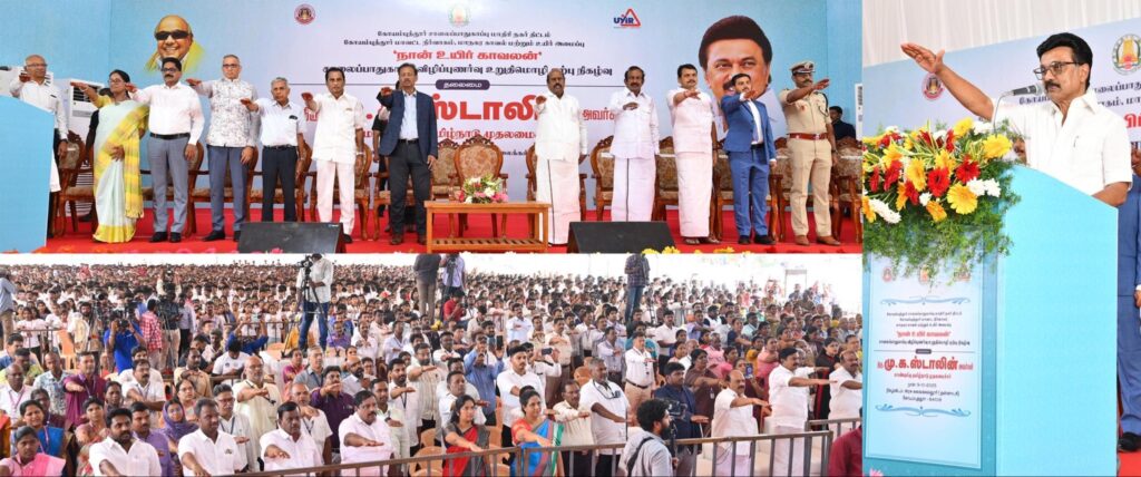 இன்னுயிர் காப்போம் – நம்மை காக்கும் 48′ திட்டம் மூலமாக பல லட்சம் உயிர்களை காப்பாற்றிய மாண்புமிகு தமிழ்நாடு முதலமைச்சர் தளபதி மு.க. ஸ்டாலின் அவர்கள் தலைமையில், இன்று கோவை அரசினர் கலைக் கல்லூரியில், கோயம்புத்தூர் சாலைப்பாதுகாப்பு மாதிரி நகர் திட்டம், கோயம்புத்தூர் மாவட்ட நிர்வாகம், மாநகர காவல் மற்றும் உயிர் அமைப்பு இணைந்து நடத்திய நிகழ்வில், “நான் உயிர் காவலன் உறுதிமொழி” ஏற்கப்பட்டது. மக்கள் நலன் காக்கும் மாண்புமிகு தமிழ்நாடு முதலமைச்சர் தளபதி அவர்களுக்கு, கோவை மாவட்ட மக்களின் சார்பாக நெஞ்சார்ந்த நன்றிகளை சமர்ப்பித்து வணங்குகிறேன்.