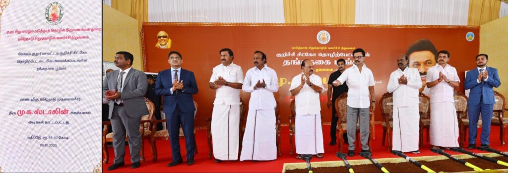 கழகத் தலைவர், மாண்புமிகு தமிழ்நாடு முதலமைச்சர் தளபதி மு.க. ஸ்டாலின் அவர்கள், இன்று, தமிழ்நாடு சிறுதொழில் வளர்ச்சி நிறுவனத்தின் சார்பில், கோயம்புத்தூர், குறிச்சி சிட்கோ தொழிற்பேட்டையில் 126.12 கோடி ரூபாய் மொத்த திட்ட மதிப்பீட்டில், முதற்கட்டமாக 81.40 கோடி ரூபாய் மதிப்பில், ஐந்து தளங்களுடன் அமைக்கப்படவுள்ள தங்கநகை பூங்கா பணிகளுக்கு அடிக்கல் நாட்டினார். மாண்புமிகு தமிழ்நாடு முதலமைச்சர் தளபதி அவர்களுக்கு கோவை மாவட்ட தங்க நகை தொழிலில் ஈடுபடும் தொழில் முனைவோர்கள் மற்றும் பணியாளர்களின் சார்பாக பாதம் பணிந்த நன்றிகளை தெரிவித்து மகிழ்கிறேன்.
